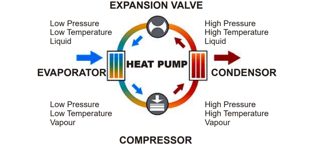 The heat pump works on the same characteristics as a standard domestic fridge but, instead of cooling, it heats. Heating and cooling are achieved by moving a refrigerant through various indoor and outdoor coils and components. A compressor, condenser, expansion valve and evaporator are used to change the state of refrigerant from a liquid to a hot gas and from a gas to a cold liquid.